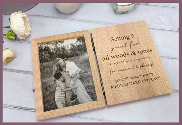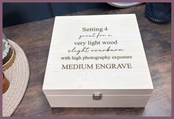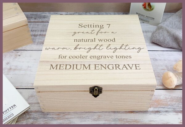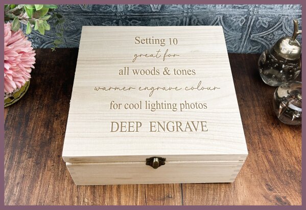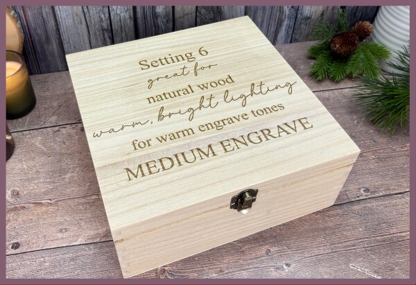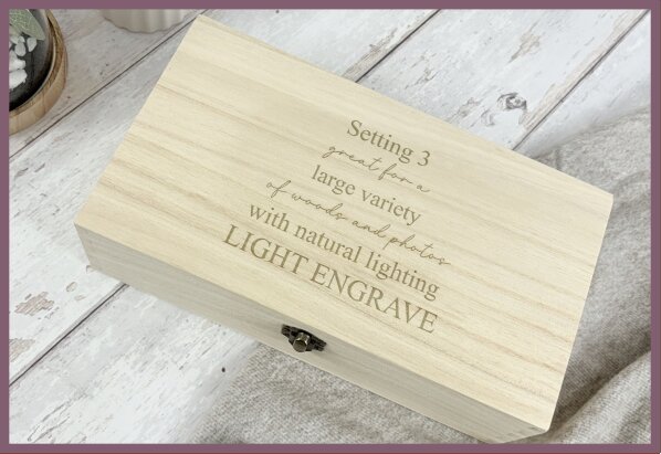 Visual result: A soft, subtle engrave that keeps fine detail without overpowering the wood.