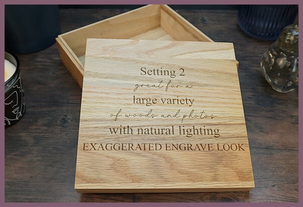 Visual guide to all 10 wood engraving settings. Find the perfect effect for your product photography.