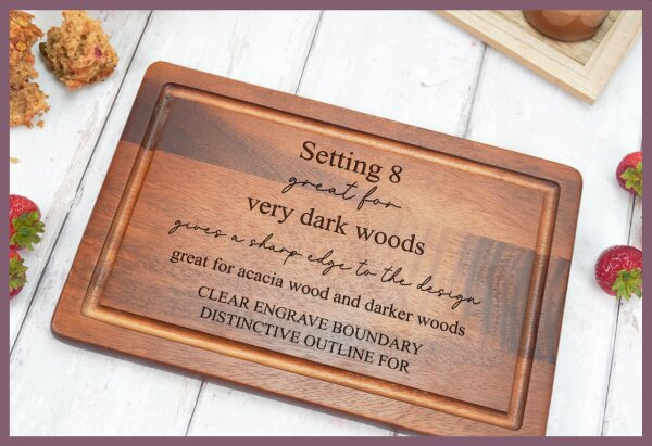 Very light woods (pine, birch) often need settings 3, 4, or 5 to maintain visibility. Dark woods (walnut, acacia) work best with setting 8 for crisp definition.
